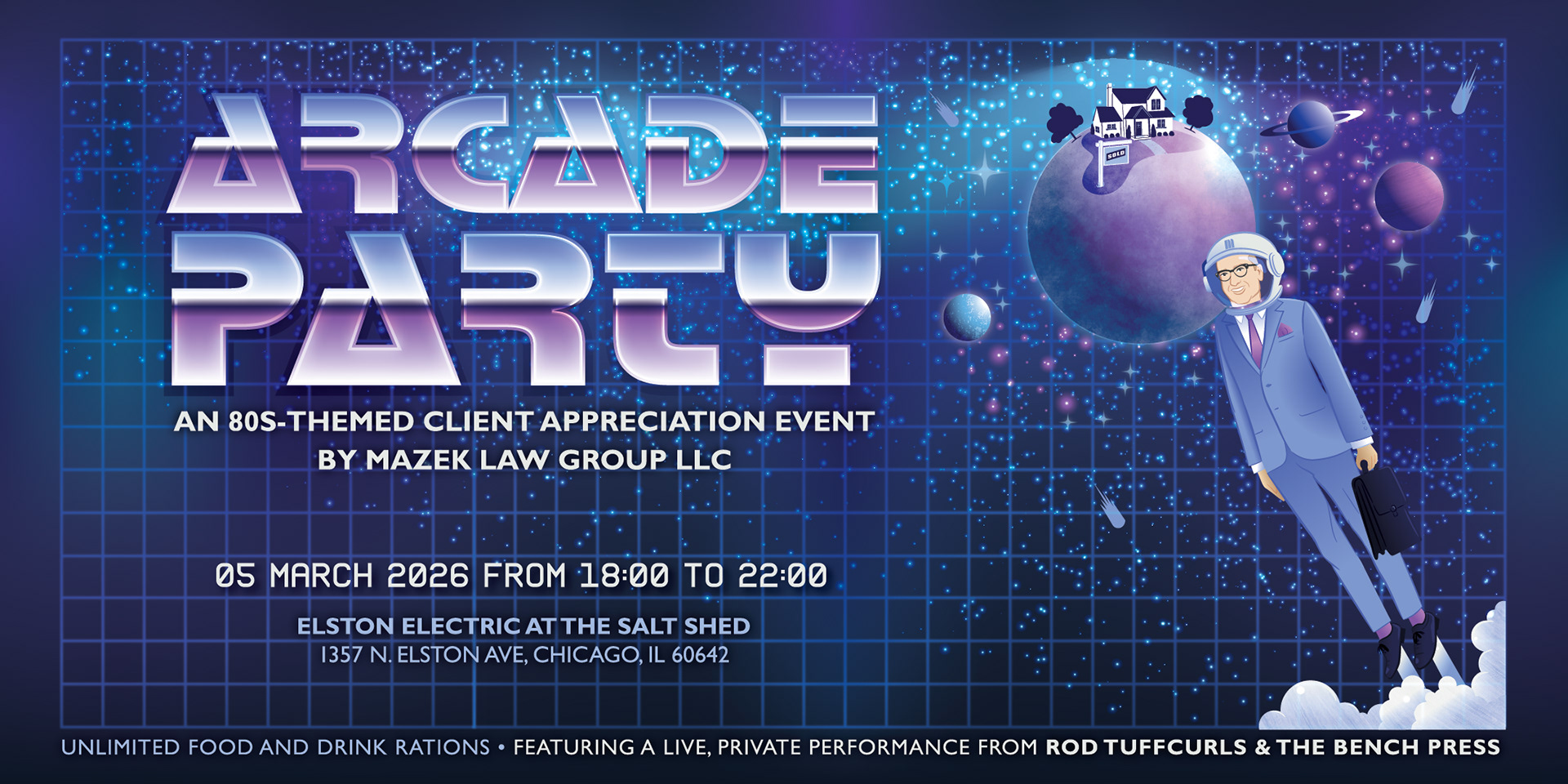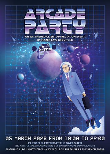 Custom illustrated event poster created for Mazek Law Group’s annual client appreciation event held at the Electric Arcade inside the Salt Shed in Chicago. The client requested an 80s arcade-inspired visual style to match the gaming venue and create a fun, nostalgic atmosphere for attendees.