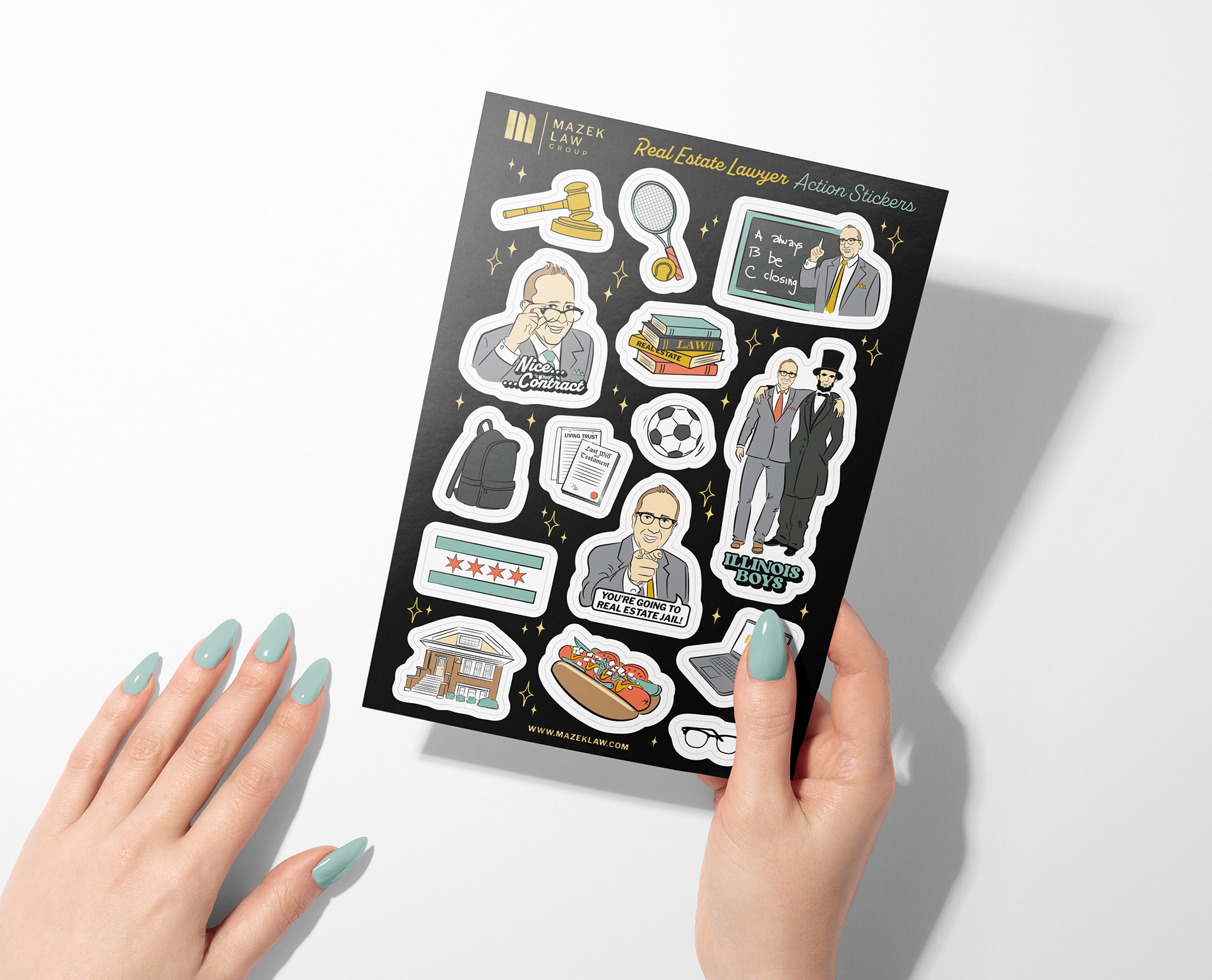 A custom illustrated sticker sheet created for Mazek Law Group to distribute at community events and client outreach opportunities.